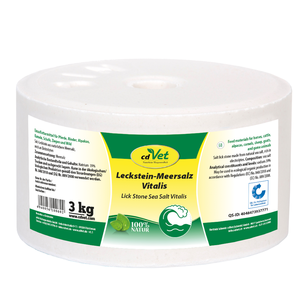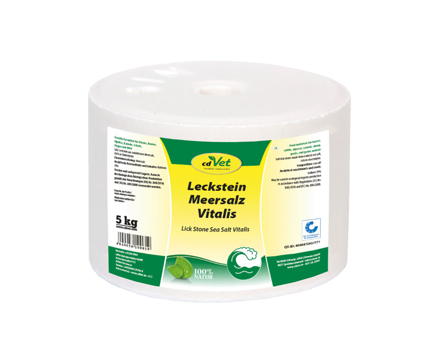 Nuestro Bloque de Sal Marina Vitalis cdVet ofrece a su animal una fuente de sal natural y de alta calidad a base de sal marina para el autoabastecimiento individual. A diferencia de la sal común, la sal marina contiene aún una serie de minerales y oligoelementos que apenas se encuentran en la sal de mesa "doméstica", en una proporción equilibrada por la naturaleza.