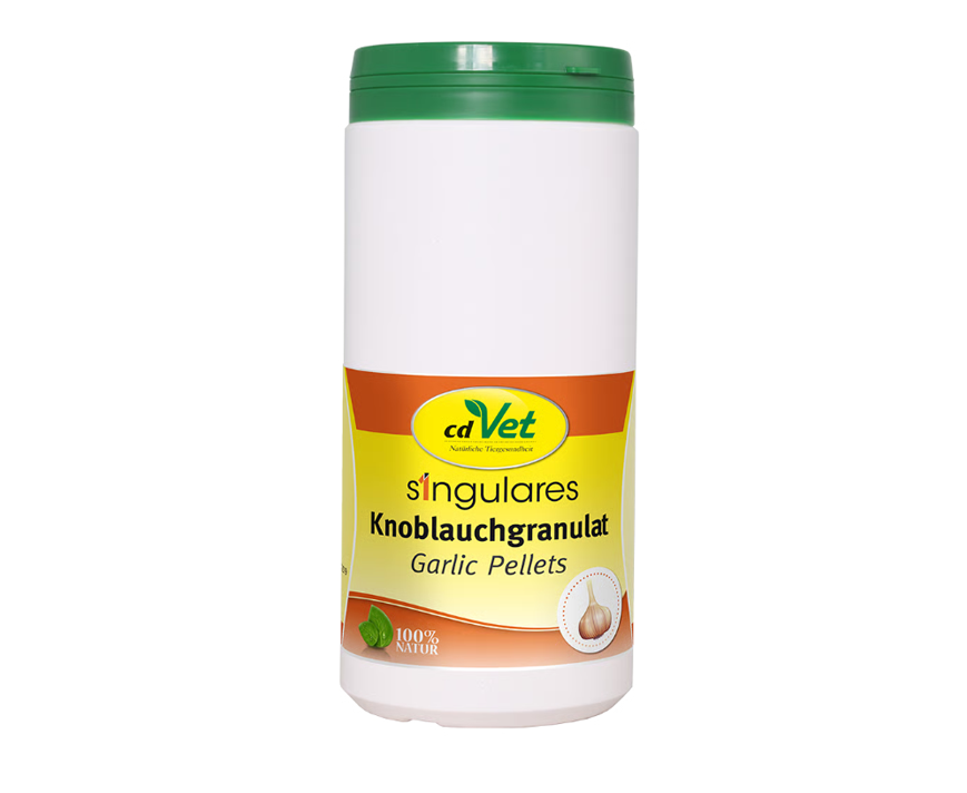 - Alimento simple para animales a base de gránulos de ajo puro.